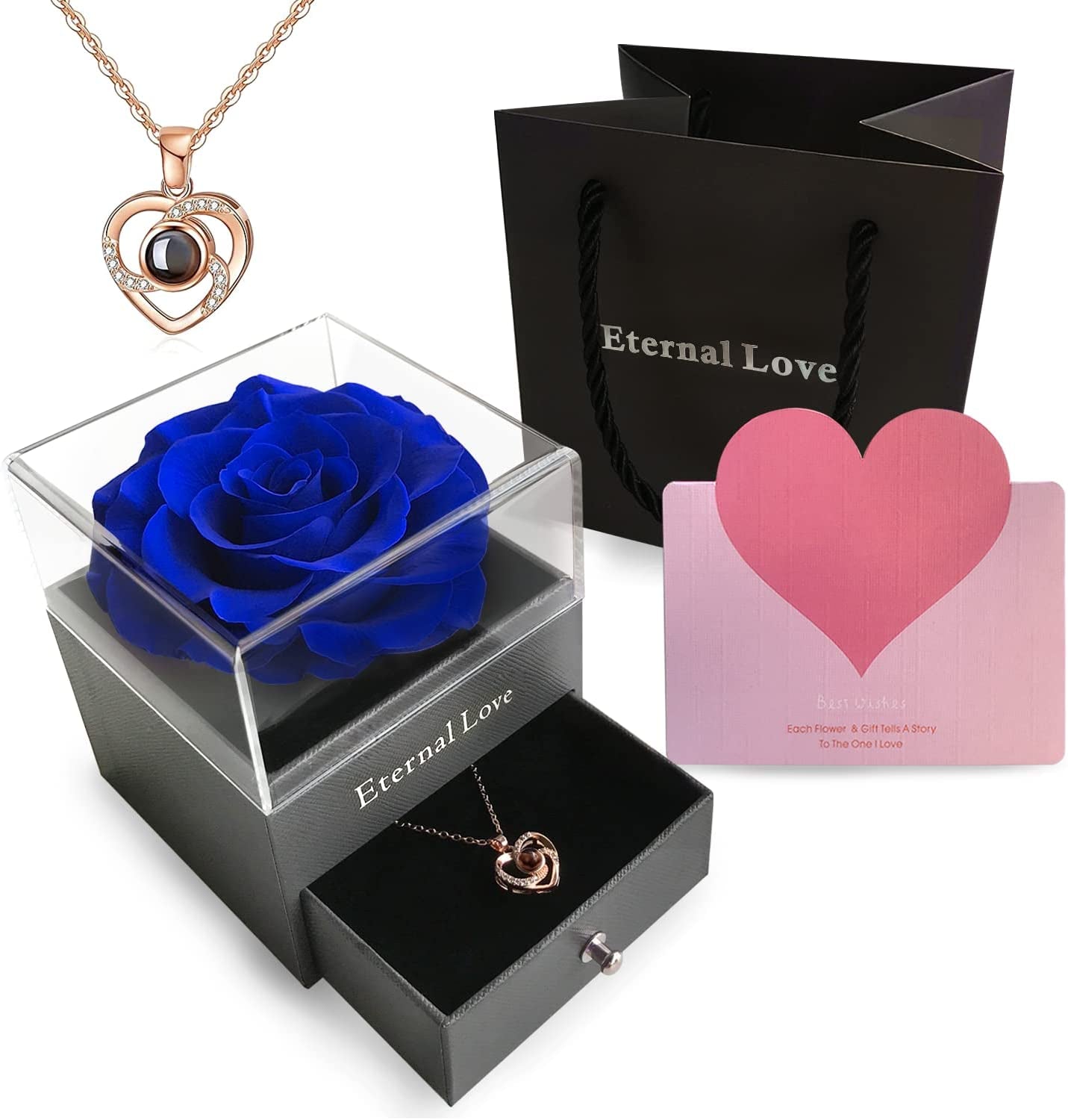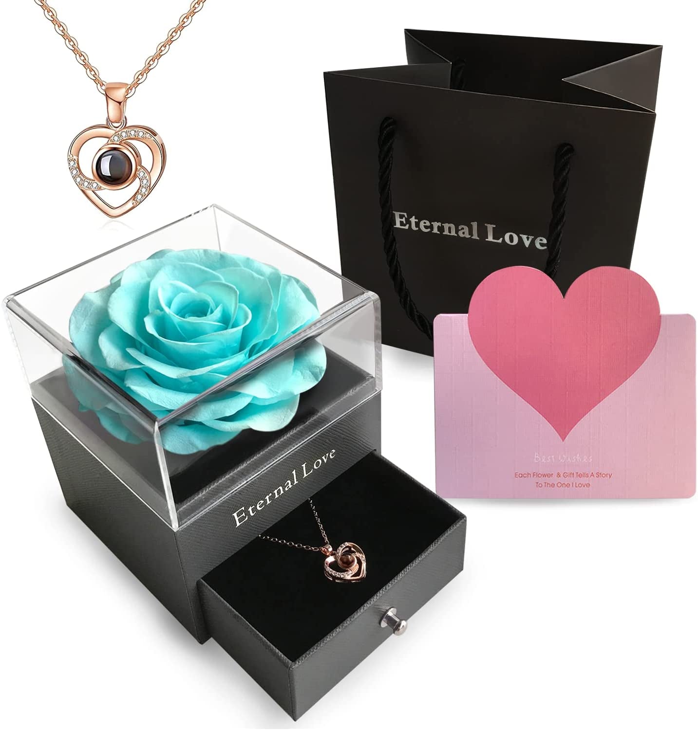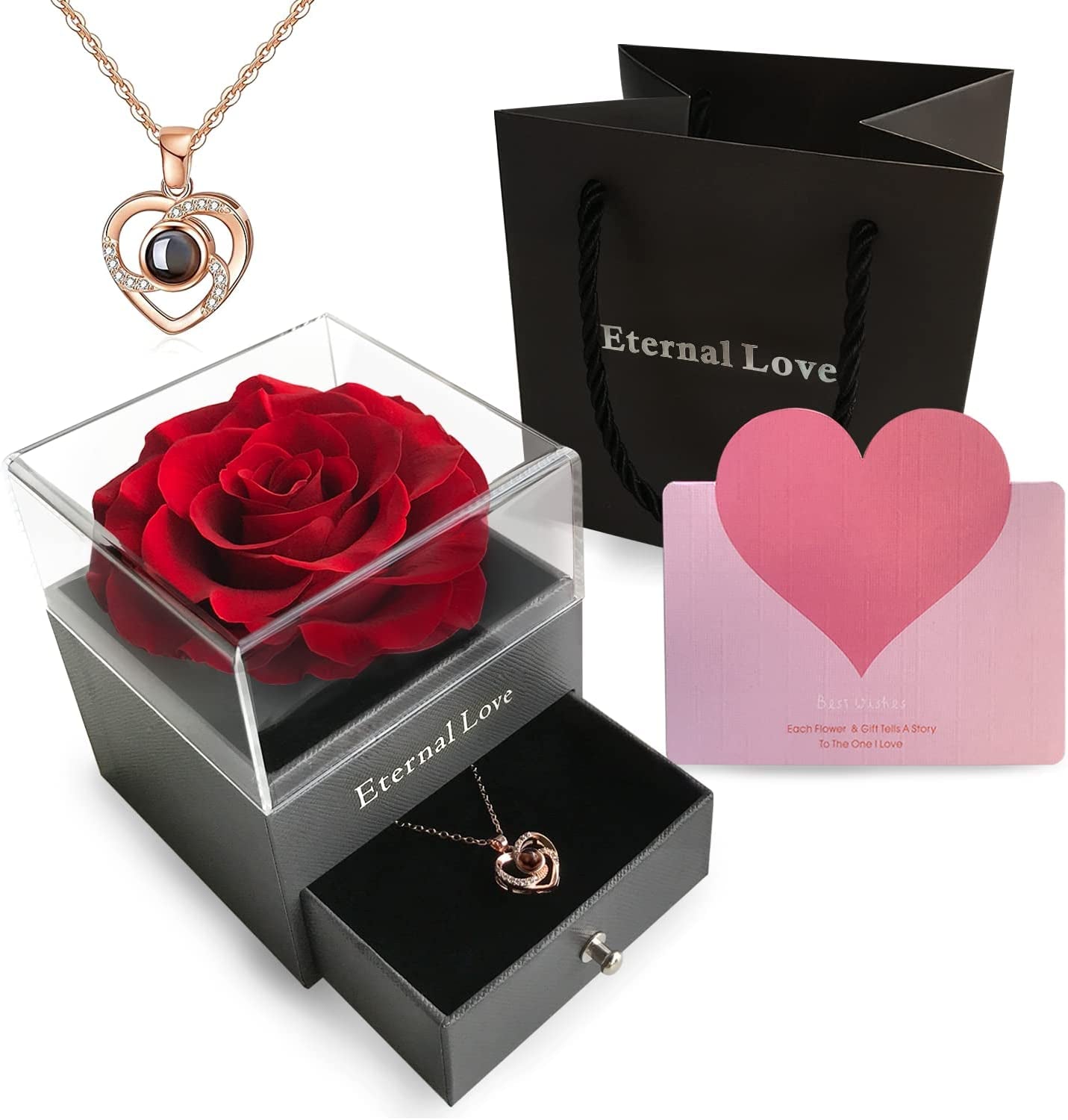 - Cadeau tout-en-un : Comprend une rose éternelle, un collier spécial, une carte de vœux personnalisable et un sac d'emballage élégant.