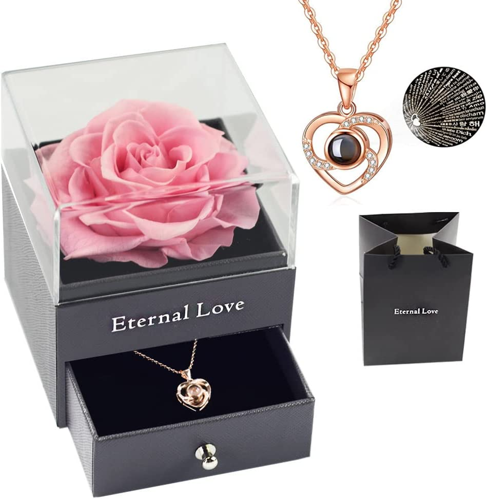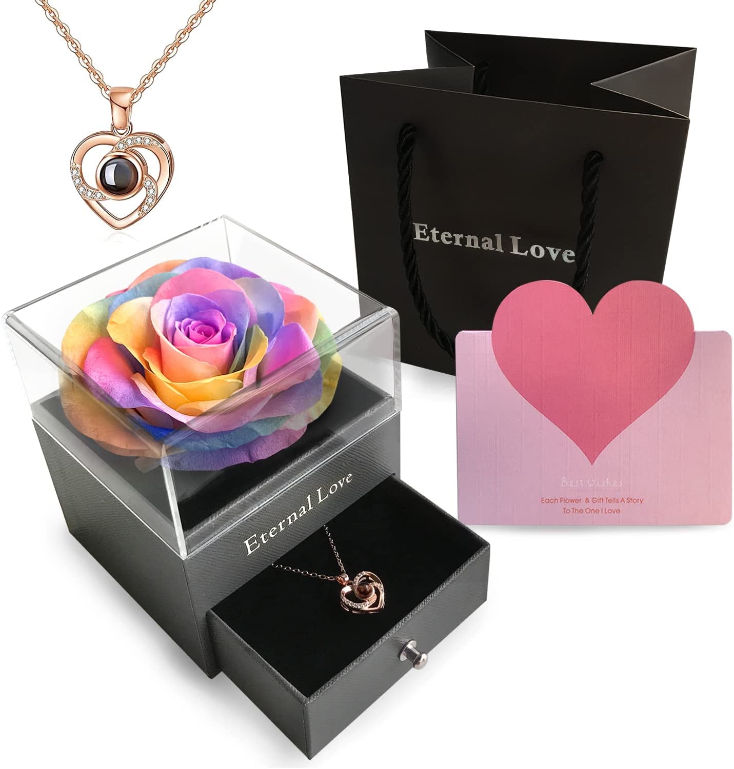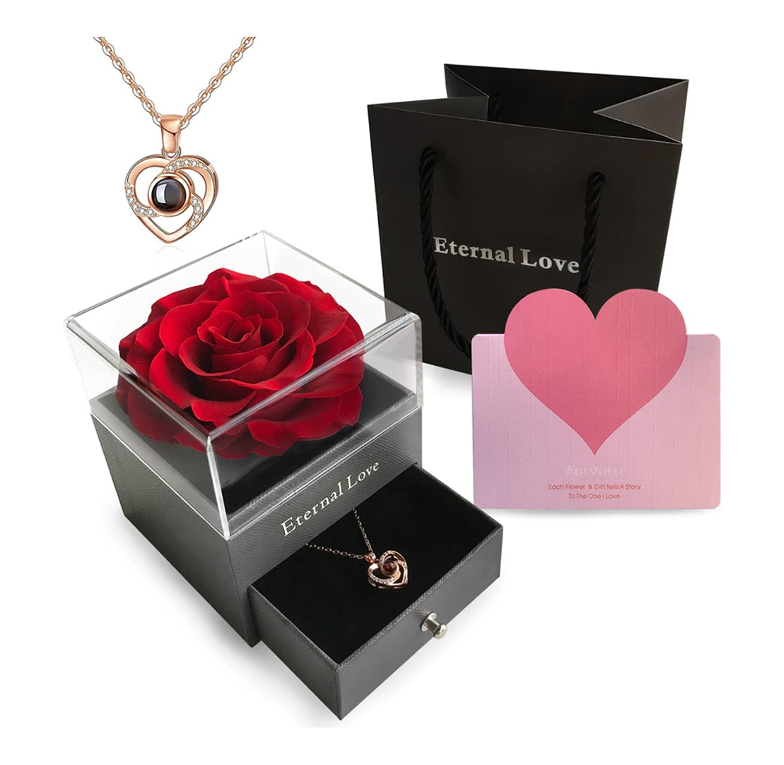 - Cadeau tout-en-un : Comprend une rose éternelle, un collier spécial, une carte de vœux personnalisable et un sac d'emballage élégant.
