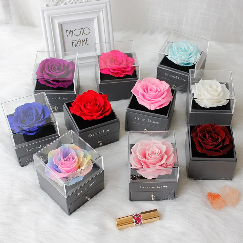 - Rose naturelle préservée : Utilise de vraies roses fraîches pour une durabilité de 3 à 5 ans sans besoin d'eau ni de soins quotidiens.